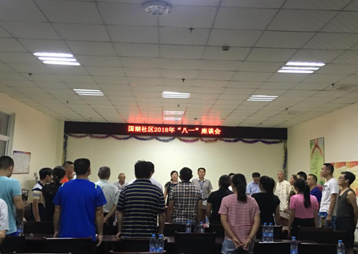 在國湖社區活動室內,嘹亮的軍歌聲中,座談會正式開始,社區主任首先致“八一”歡迎詞,并匯報社區“雙擁”工作開展情況;隨后,5名復轉軍人代表發言,其他參與人員也先后談了感想,并建議與社區共同做一些公益活動,齊心協力推進社區和諧穩定發展。最后,社區主任做了總結性發言,并就下一步的“雙擁”工作表態,將嚴格按照優撫政策,依法依規盡最大努力,做好擁軍優屬工作。座談會在集體合唱《戰友之歌》聲中圓滿結束。