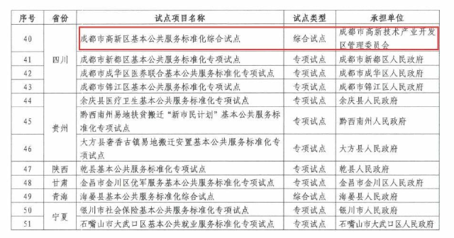 中國食品網播報(閆靜 葉青報道)近日,國家市場監督管理總局、國家發展和改革委員會、財政部聯合印發《關于下達國家基本公共服務標準化試點的通知》,確定了首批51項國家基本公共服務標準化試點項目,成都高新區名列其中,是西南地區唯一一個承擔綜合試點的單位。