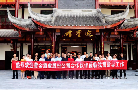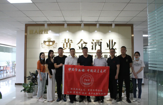 中國食品藥品企業質量促進會發酵食品專委會、中國食品報中國酒產區行調研團隊走進黃金酒業,與黃金酒業管理團隊合影。