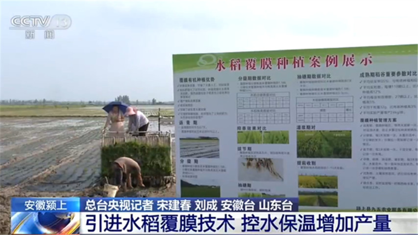 夏播糧食作物主要是玉米和中稻。在位于沿淮行蓄洪區(qū)的安徽阜陽市潁上縣,插秧機(jī)在平整好的田地里來回穿梭,和一般機(jī)插秧不同的是,在這些秧苗下面,還有一層黑色的地膜,這是潁上縣今年新引進(jìn)的水稻覆膜技術(shù)。