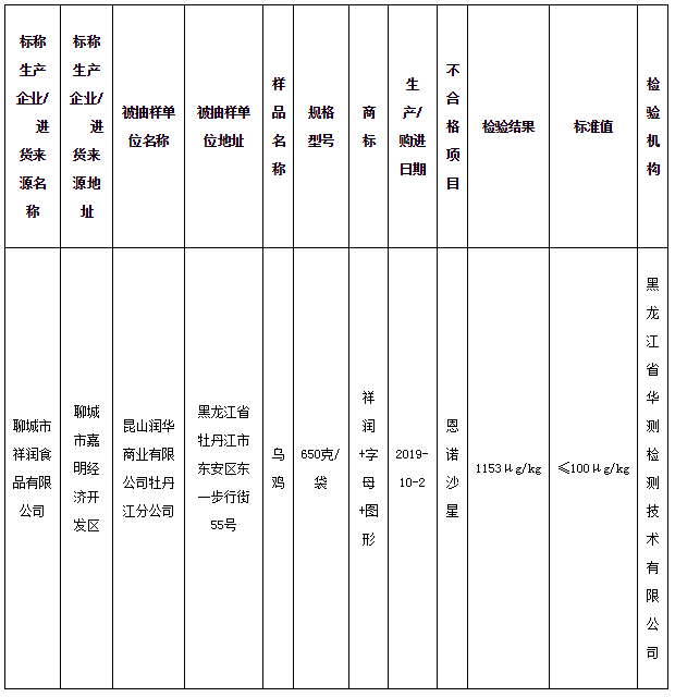 信息顯示,昆山潤(rùn)華商業(yè)有限公司牡丹江分公司銷售的標(biāo)稱聊城市祥潤(rùn)食品有限公司生產(chǎn)的烏雞(生產(chǎn)日期2019年10月2日),被檢出恩諾沙星不符合食品安全國家標(biāo)準(zhǔn)規(guī)定。檢驗(yàn)機(jī)構(gòu)為黑龍江省華測(cè)檢測(cè)技術(shù)有限公司。