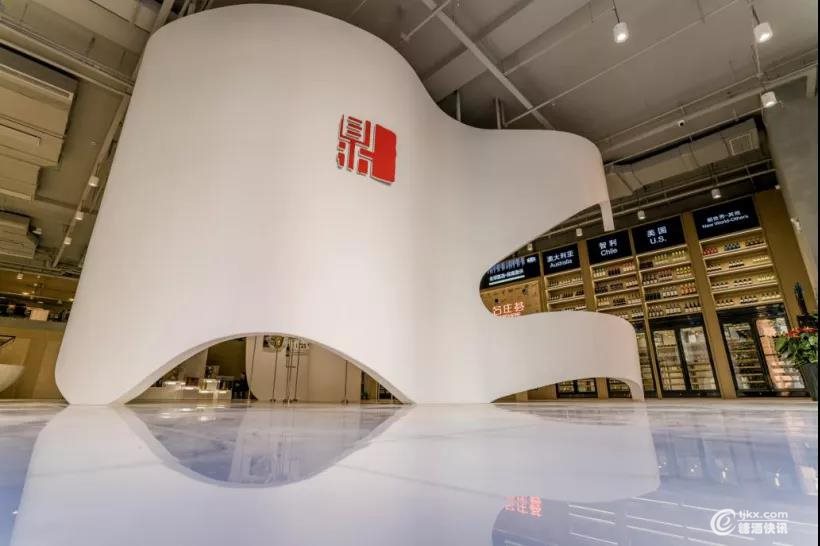 紅酒展示區匯集了拉菲、瑪歌等世界各地知名酒莊紅酒,別致酒架層層排列,頂部木質裝飾拉伸了空間視覺長度,簡潔的射燈映射出每一瓶酒獨有的特性與吸引力,整個空間儼如酒窖般精致,給人以強烈的視覺印象。懸掛亞克力球體的圓柱盛放各類酒品,象征每一瓶美酒都挑選自顆粒飽滿的葡萄,整體猶如一棵飽含結晶的樹,極富現代感和開放的流動性。頂部的鏡面反射,既拉伸了視覺空間,凸顯了產品特性,又增添些許科技感。