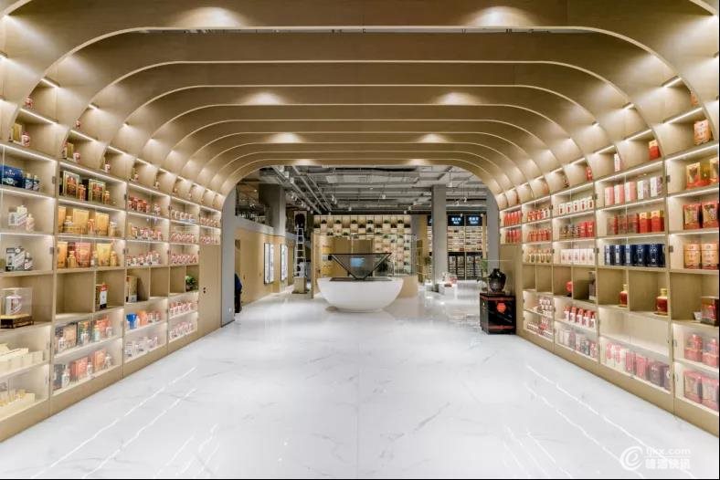 白酒展示區整體設計以酒窖為原型,集中展示了茅臺、五糧液等中國八大名酒及珍藏精品老酒。展示區流動柔和的曲線設計,為整個空間注入靈性躍動的美感。