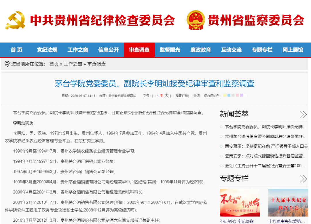 7月7日,貴州省紀檢監察委官方消息,貴州茅臺股份有限公司原副總經理張家齊、茅臺學院黨委委員、副院長李明燦接受紀律審查和監察調查。