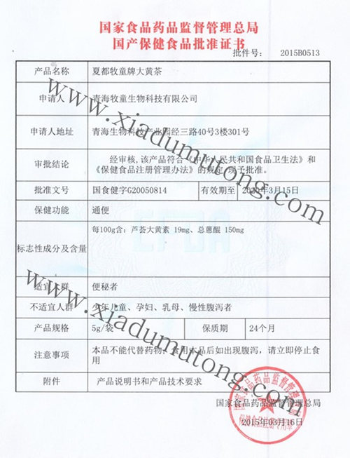 青海夏都牧童牌大黃茶是由原國家食品藥品監督管理局批準的國食健字號產品。