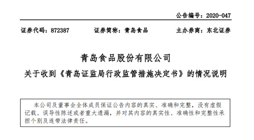 上述行為違反了《非上市公眾公司監(jiān)督管理辦法》(證監(jiān)會(huì)令第96號(hào))第二十條的相關(guān)規(guī)定,青島證監(jiān)局決定對(duì)青島食品采取責(zé)令公開說明的行政監(jiān)管措施,并記入證券期貨市場誠信檔案。