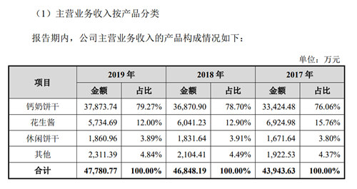 此外,青島食品的主營業(yè)務(wù)中,鈣奶餅干仍然一家獨(dú)大。招股書顯示,2017年-2019年,鈣奶餅干產(chǎn)品銷售額分別為3.34億元、3.68億元、3.87億元,占比分別為76.06%、78.7%、79.27%,貢獻(xiàn)的毛利占主營業(yè)務(wù)毛利的比例分別為93.48%、93.10%、92.94%。