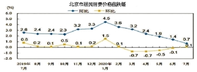 國家統(tǒng)計局北京調(diào)查總隊昨天發(fā)布的最新一期北京市消費價格指數(shù)數(shù)據(jù)顯示,本市CPI同比漲幅已連續(xù)6個月處于回落態(tài)勢。7月份,北京居民消費價格環(huán)比上漲0.1%,同比上漲0.7%,漲幅比6月回落0.7個百分點。據(jù)測算,在0.7%的同比漲幅中,去年價格變動的翹尾影響約為1.0個百分點,今年新漲價影響為負0.3個百分點。