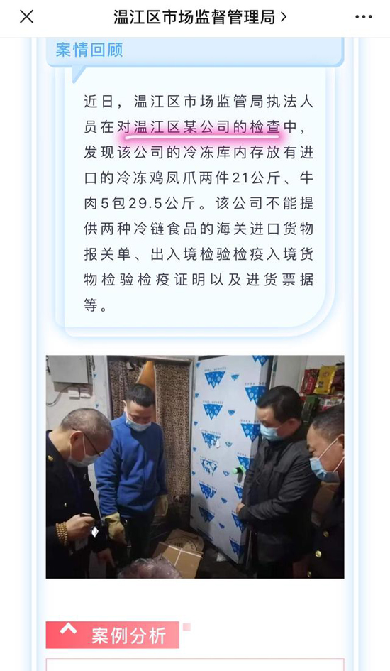 據媒體報道,近日,四川省成都市溫江區市場監管局執法人員對轄區內某公司的檢查中,發現該公司的進口冷凍產品不能提供海關進口貨物報關單、出入境檢驗檢疫入境貨物檢驗檢疫證明以及進貨票據等。該公司行為涉嫌違反《中華人民共和國食品安全法》相關規定,溫江區市場監管局擬給予當事人警告、沒收違法肉制品并處罰款10萬元。