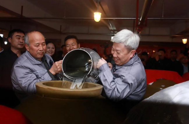 在酒庫內空地,基酒庫管員按照制酒生產工藝流程規范,依次測量濃度、分型、計量后入庫。分型環節由汪洪彬董事長親自品評;入庫時,基酒庫管員將酒倒入酒壇中,汪董事長與生產車間王云明主任共同封壇。