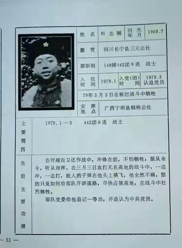 葉志剛烈士是442團9連戰士,四川省長寧縣人,一等功臣。葉志剛是四川省宜賓市長寧縣三元鄉人,1960年生,1979年3月在自衛還擊,保衛邊疆作戰中英勇犧牲,年僅19歲。戰后部隊黨委給他追記一等功,追認為中國共產黨黨員。