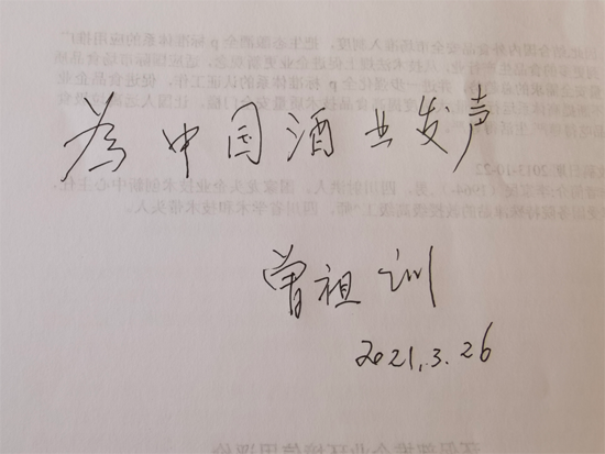 接受中國食品報(bào)中國酒團(tuán)隊(duì)專訪,并欣然題字勉勵。