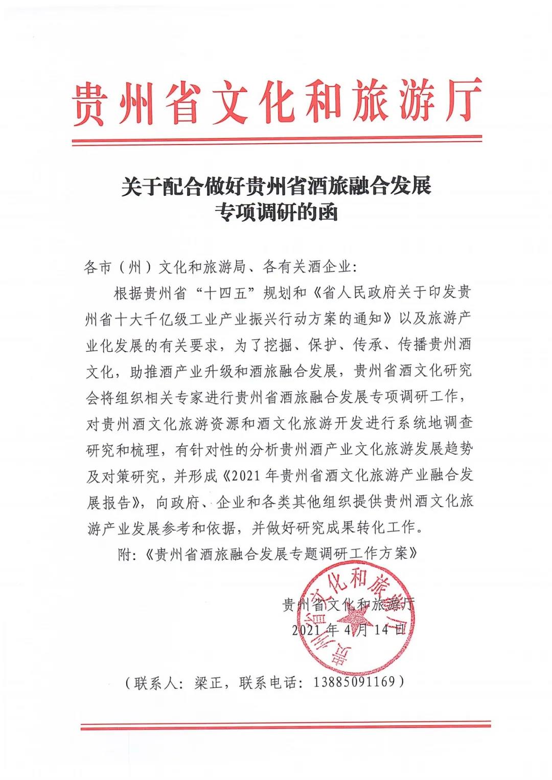 2021年4月14日,“貴州省酒旅融合產業發展專題調研”工作正式啟動。此次專項調研工作將對貴州酒文化旅游資源和酒文化旅游開發進行系統地調查研究和梳理,有針對性的分析貴州酒產業文化旅游發展趨勢及對策研究,并形成《2021年貴州省酒文化旅游產業融合發展報告》,向政府、企業和各類其他組織提供貴州酒文化旅游產業發展參考和依據,并做好研究成果轉化工作。