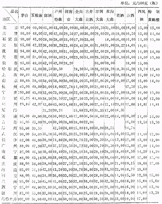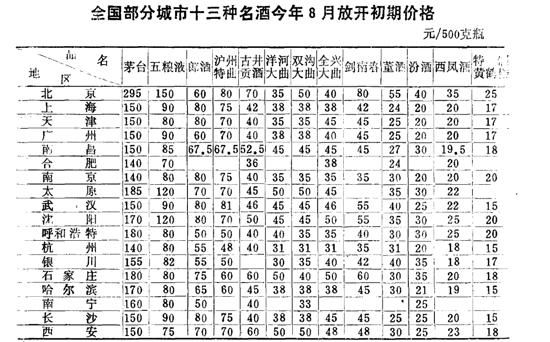 1962年,中共中央、國務(wù)院批轉(zhuǎn)“關(guān)于提高各種名酒、用糧食釀造的白酒、啤酒的銷售價(jià)格的報(bào)告”,各種酒銷售價(jià)格提高,并首先在縣城以上的城市及經(jīng)濟(jì)作物區(qū)敞開供應(yīng)。凡是有利潤的酒廠,出廠價(jià)一律不變,出廠價(jià)過低的報(bào)省政府批準(zhǔn)調(diào)整。高價(jià)酒的利潤,實(shí)行中央財(cái)政和地方財(cái)政分成制度。中央七成,地方三成。國營工業(yè)部門、糧食部門和其他部門附屬酒廠生產(chǎn)的名酒、糧食白酒一律由專賣公司包銷,不得自銷或自留。之后因?yàn)楦邇r(jià)名酒積壓,于1963年高價(jià)名酒降價(jià)退出高價(jià)行列。茅臺零售價(jià)由16元降至3.6元,瀘州特曲酒零售價(jià)由12元降至2.5元,西鳳酒由10元降至2.7元,汾酒零售價(jià)由10元降至2.4元。