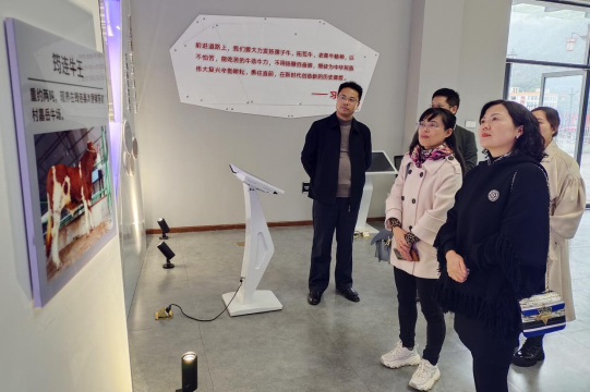 在“筠連黃牛文化館”,王強一行對筠連黃牛產業(yè)智慧平臺體系進行了考察,就如何進一步完善平臺遠程技術指導、技術咨詢和肉牛養(yǎng)殖、畜草種植、屠宰管理、產品加工、天氣預報等系統(tǒng)提出指導意見,就如何利用好智慧平臺推動養(yǎng)牛技術普及、助力產業(yè)發(fā)展提出要求。隨后,王強一行參觀了文化館現(xiàn)代農業(yè)園區(qū)沙盤展示平臺、筠連黃牛歷史文化展及筠連農特色產品展示區(qū)。