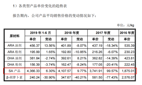 截至2019年上半年,燕窩酸是嘉必優(yōu)單價(jià)最高的一款產(chǎn)品。嘉必優(yōu)招股書(shū)顯示,2019年上半年各主營(yíng)產(chǎn)品的單價(jià)中,SA(即燕窩酸)產(chǎn)品的單價(jià)高達(dá)4366.33元/千克,遠(yuǎn)超過(guò)嘉必優(yōu)其他主營(yíng)產(chǎn)品的單價(jià),并且SA產(chǎn)品的單價(jià)從2016年以來(lái)逐年走高。此后,嘉必優(yōu)沒(méi)有對(duì)外披露主營(yíng)產(chǎn)品的單價(jià)數(shù)據(jù)。