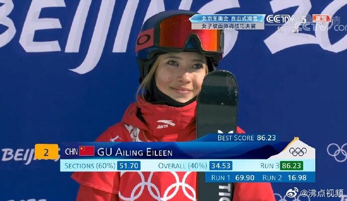 個人第二塊獎牌!今日,谷愛凌在北京冬奧會女子自由式滑雪坡面障礙技巧決賽中,頂住壓力,奪得一枚銀牌。7天前,她以轉(zhuǎn)體1620度女子最高難度動作,獲得自由式滑雪女子大跳臺冠軍,創(chuàng)造了中國冰雪歷史。