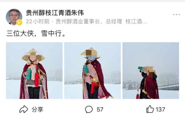 具體而言,朱偉發(fā)布了三張身著古裝、頭戴蓑笠的未成年少女圖片。圖片中,少女在大雪中一手拿貴州青酒,一手配劍,有的做出飲酒動作。而朱偉則配文:“三位大俠,雪中行。”