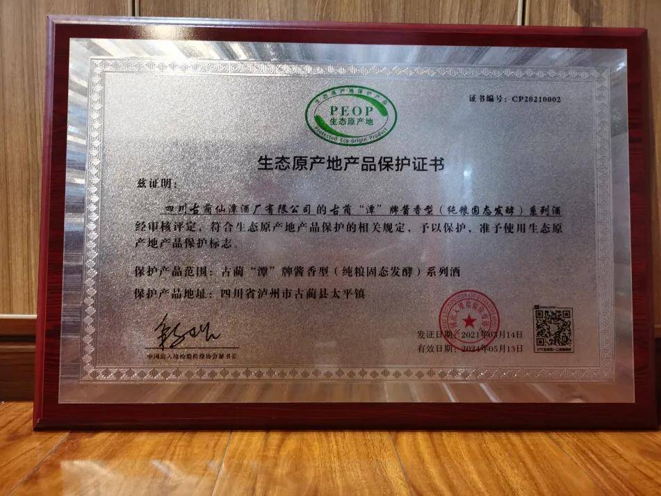 值得注意的是,“潭”牌醬香型(純糧固態發酵)系列酒于2021年獲得了生態原產地保護認證,取得國家保護,是國家品牌,獲得生態標簽的產品可以塑造企業及其產品在國內國際市場上的知名度和整體形象,提高產品附加值、贏得更多消費者,它是綠色、健康、環保的最有力證明。生態原產地產品是指產品生命周期中,符合綠色、低碳、節能、循環要求、并具有原產地特征與特性的良好生態型產品。在包裝及產品說明中,貼上生態原產地保護產品標志, 在市場銷售推廣提升競爭力,提升產品檔次贏得市場提高銷售額。優化產品質量,提升品牌形象,獲得產品溢價,提高經濟效益,達到生態化、高質量的目的,生態產品是實現鄉村振興的有效途徑。