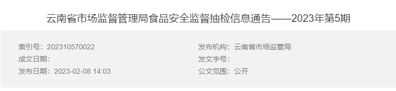 近日,從云南省市場監督管理局食品安全監督抽檢信息通告(2023年第5期)獲悉,云南省市場監督管理局組織食品安全監督抽檢,抽取糧食加工品、肉制品、乳制品、速凍食品、酒類、蔬菜制品、糕點、餐飲食品、食用農產品9個大類572批次樣品,其中合格樣品560批次,不合格樣品12批次。