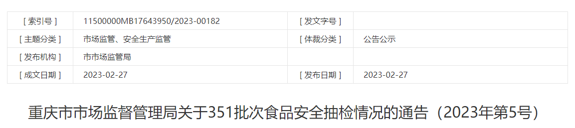 面對食品造假問題,監管部門堅決“零容忍”查處。近日,從重慶市市場監督管理局關于351批次食品安全抽檢情況的通告(2023年第5號)獲悉,市場監管局抽檢餅干、餐飲食品、炒貨食品及堅果制品、淀粉及淀粉制品、豆制品、方便食品、糕點、罐頭、酒類、糧食加工品、肉制品、乳制品、食用農產品、食用油、油脂及其制品、蔬菜制品、薯類和膨化食品、速凍食品、糖果制品、調味品、飲料等20類食品351批次樣品。其中合格樣品339批次,不合格樣品12批次。