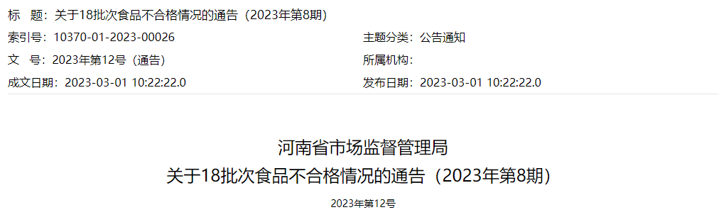 近日,從河南省市場監(jiān)督管理局關于18批次食品不合格情況的通告(2023年第8期)獲悉,市場監(jiān)管局抽檢餐飲食品,茶葉及相關制品,炒貨食品及堅果制品,淀粉及淀粉制品,豆制品,方便食品,糕點,食品添加劑,食用農產(chǎn)品,食用油、油脂及其制品,速凍食品,飲料,糖果制品,保健食品14大類食品638批次樣品。其中合格樣品620批次,不合格樣品18批次。