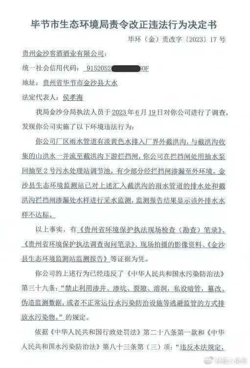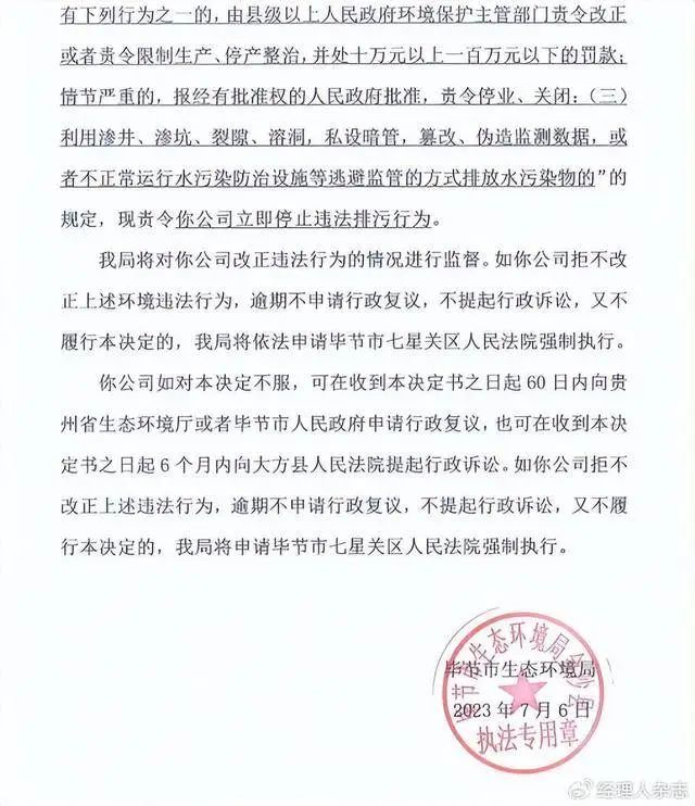 2023年7月,又因“廠區(qū)雨水管道有淡黃色水排入廠界外截洪溝,與截洪溝收集的山洪水一并流至截洪溝下游攔擋閘,在攔擋閘處用抽水泵回抽至2號(hào)污水處理站調(diào)節(jié)池,有少部分經(jīng)攔擋閘滲至外環(huán)境,采水監(jiān)測(cè)監(jiān)測(cè)報(bào)告結(jié)果顯示該外排水水樣不達(dá)標(biāo)”,被畢節(jié)市生態(tài)環(huán)境局發(fā)出責(zé)令改正違法行為決定書(shū)。