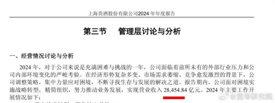 另外一個(gè)被特別關(guān)注的是,2024年度報(bào)告第三節(jié)的“管理層討論與分析”章節(jié),上海貴酒稱:“報(bào)告期內(nèi),公司面對(duì)困境實(shí) 施戰(zhàn)略轉(zhuǎn)型,精簡(jiǎn)組織,努力推動(dòng)業(yè)務(wù)發(fā)展,實(shí)現(xiàn)營業(yè)收入28,454.84億元。”,第二節(jié)的營收顯示的是284,548,362.07元。標(biāo)注單位不一致,可謂是天差地別。也可能是“不小心”,但是,這樣的錯(cuò)誤對(duì)于專業(yè)財(cái)務(wù)人員而言無疑是致命錯(cuò)誤。上市公司報(bào)表是多么嚴(yán)謹(jǐn)?shù)氖虑椋霈F(xiàn)如此重大數(shù)字書寫錯(cuò)誤,實(shí)屬不該。也暴露出企業(yè)內(nèi)部管理漏洞與經(jīng)營風(fēng)險(xiǎn)存在。國酒研究所、酒莊頭條