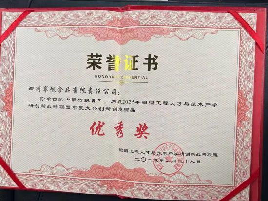 值得關注的是,本次大會對創新創意酒品品鑒活動中的獲獎企業進行了頒獎。在頒獎名單中,我們發現一位老人上臺領獎,他就是現年78歲高齡的一等傷殘退伍軍人、被譽為“鋼鐵醬人”的四川翠微食品有限公司創始人張仲安。研發的“翠微飄香酒”以竹汁優雅的清香淡雅風味,入口綿回味悠長的特點,榮獲2025釀酒創新聯盟創新創意酒品大賽優秀獎。