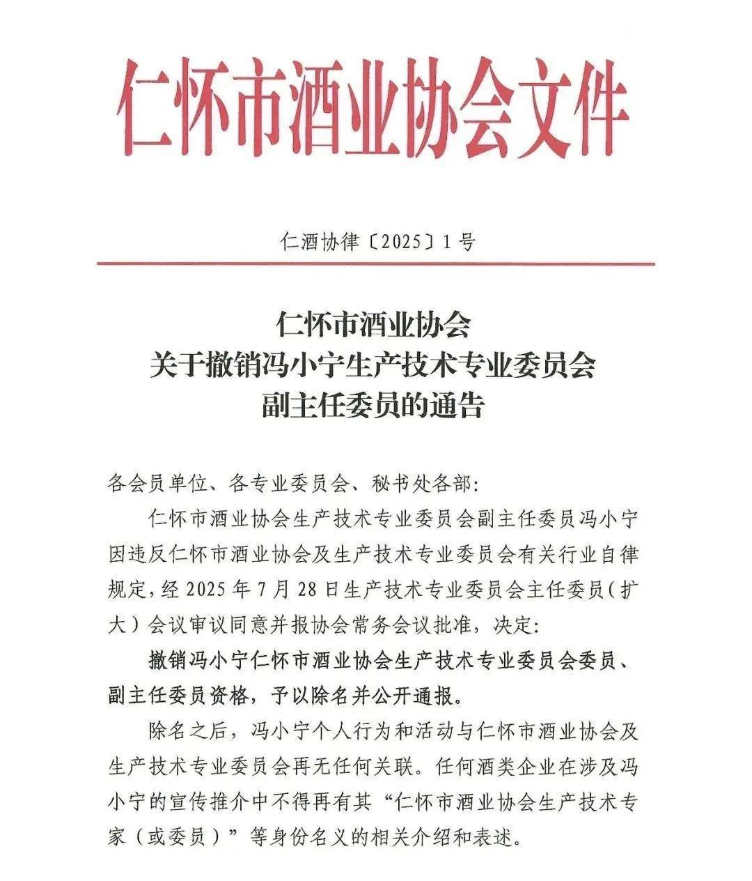通告中顯示,仁懷市酒業(yè)協(xié)會生產(chǎn)技術專業(yè)委員會副主任委員馮小寧因違反仁懷市酒業(yè)協(xié)會及生產(chǎn)技術專業(yè)委員會有關行業(yè)自律規(guī)定,經(jīng)2025年7月28日生產(chǎn)技術專業(yè)委員會主任委員(擴大)會議審議同意并報協(xié)會常務會議批準,決定:撤銷馮小寧仁懷市酒業(yè)協(xié)會生產(chǎn)技術專業(yè)委員會委員、副主任委員資格,予以除名并公開通報。