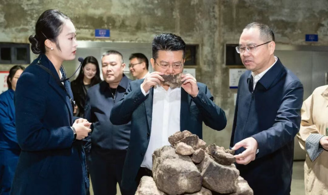 在石子鋪廠區,華濤一行走進釀酒車間,聽取珍酒“1287”釀造工藝和“831415”釀造密碼介紹,觀摩潤糧、攤晾、撒曲等生產工藝;走進放映廳和封壇酒庫,深入了解品牌歷史沿革與沉浸式體驗項目,并參與珍酒“品勾藏”。