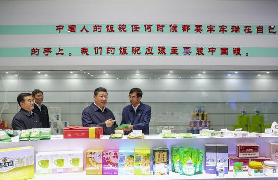 25日下午,首個“中國農民豐收節”剛過,習近平就深入三江平原腹地黑龍江農墾建三江管理局,考察糧食生產和收獲情況。他邊聽介紹,邊向農場負責人詢問今年收成如何、有沒有病蟲害、能否做到連年豐收,并強調中國人的飯碗任何時候都要牢牢端在自己的手上。在北大荒精準農業農機中心一樓大廳,當地出產的米油豆奶等各類農產品擺滿展臺。習近平走近前去,雙手捧起一碗大米,意味深長地說:“中國糧食,中國飯碗。”